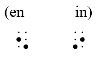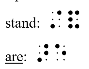 These four words, “be”, “were”, “his” and “was” are expressed by the above wordsigns, lower b, lower g, lower h, lower j, only where they are separated by a space from all other signs (except the capital indicator). Therefore, if the words adjoin lower punctuation in the print copy, they must be spelt out (for otherwise they would be regarded as punctuation themselves; e.g. a quote, etc.); and so, too, is the case where a letter is added to them, as: wasn’t, weren’t (BANA, 2002)